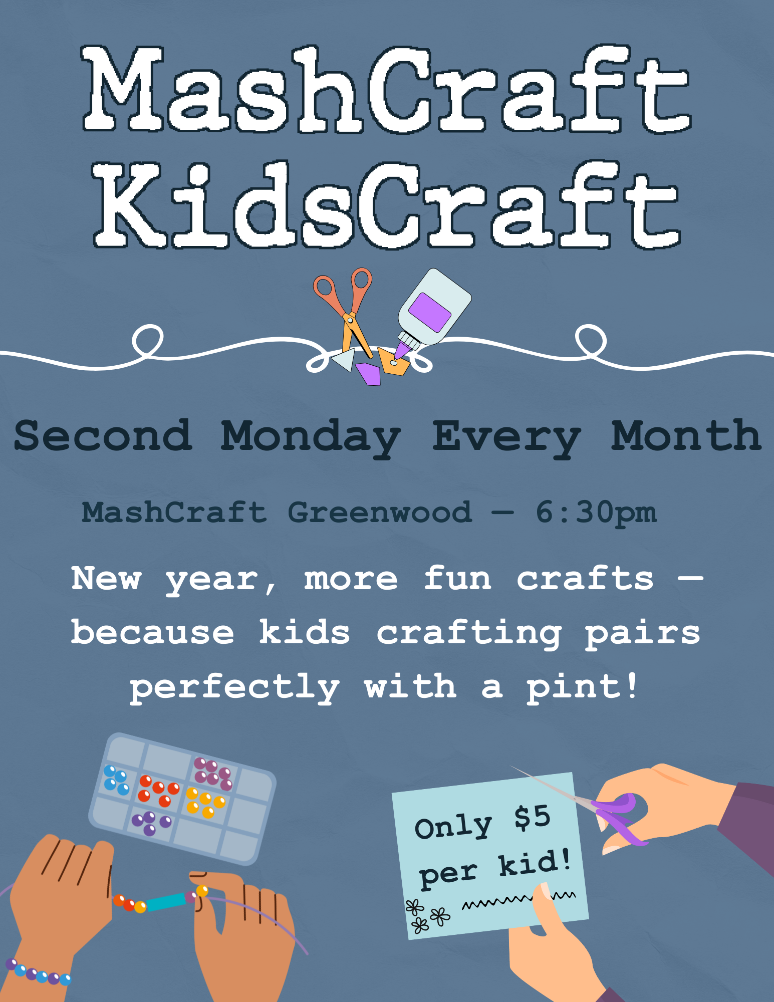 KidsCraft is designed for kids ages 5-10. At only $5 per kid, they will create crafts to take home with occasional snack crafts. Please let us know before we start if your child has any allergies we should be aware of. KidsCraft occurs on the second Monday of every month from 6:30-7:30. Parents are welcome to watch the kids craft or sit in the taproom and enjoy a delicious pint of MashCraft beer!